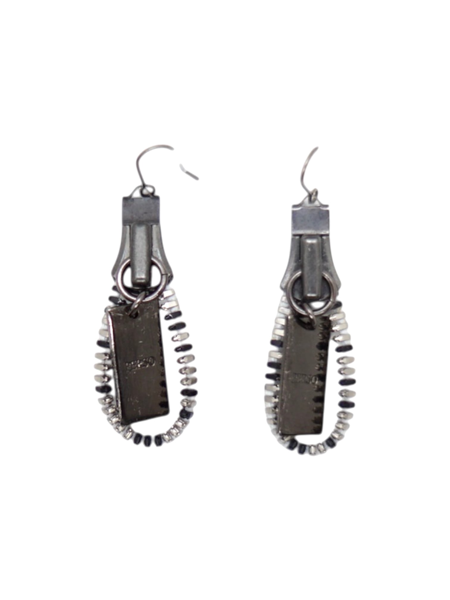 Its droplet-shaped silhouette contrasts beautifully with the mechanical rhythm of the zipper elements.